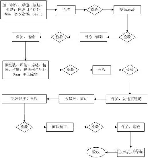 (10)構(gòu)件經(jīng)工廠噴砂除銹合格后,噴刷完成底漆和中間漆。