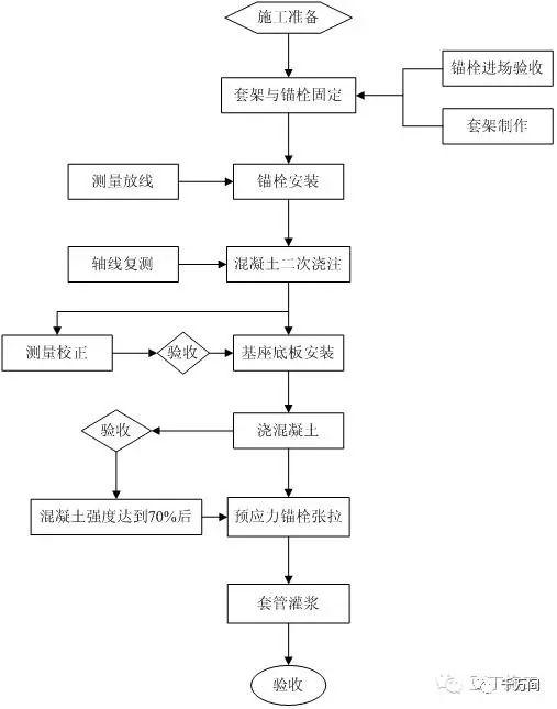 2、預(yù)應(yīng)力錨栓、基座底板施工工藝框圖