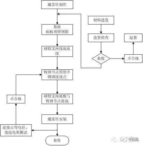 (5)鋼結(jié)構(gòu)安裝完成后將避雷針焊接到鑄鋼內(nèi)、點(diǎn)鋼管上,座部加不銹鋼肋板加固。