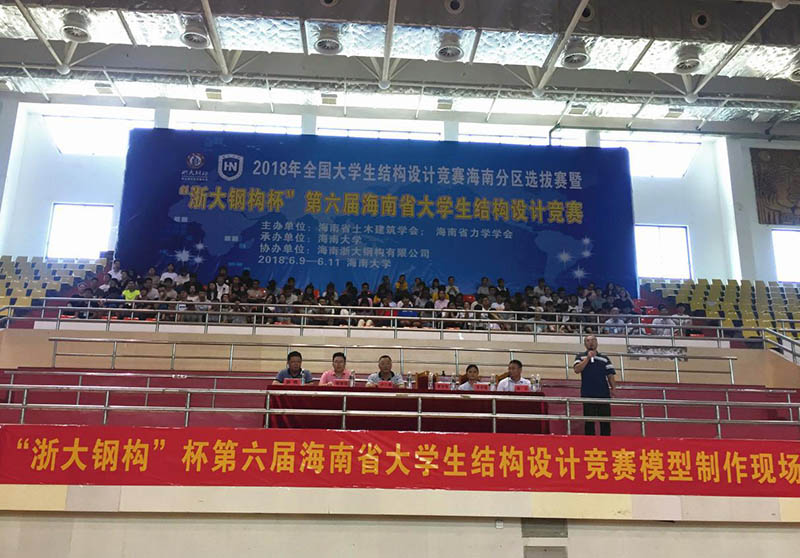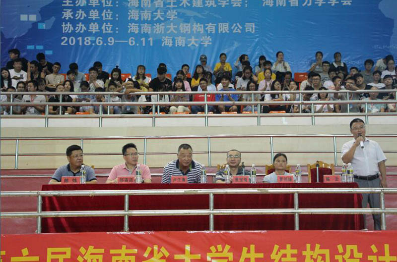 由海南省土木建筑學(xué)會(huì)、海南省力學(xué)學(xué)會(huì)聯(lián)合主辦,海南大學(xué)土木建筑工程學(xué)院承辦,海南浙大鋼構(gòu)有限公司冠名贊助的全國大學(xué)生結(jié)構(gòu)設(shè)計(jì)競賽海南分區(qū)選拔賽暨“浙大鋼構(gòu)杯”第六屆海南省大學(xué)生結(jié)構(gòu)設(shè)計(jì)競賽,于6月9日上午9時(shí)在海南大學(xué)聯(lián)誼館正式開幕。