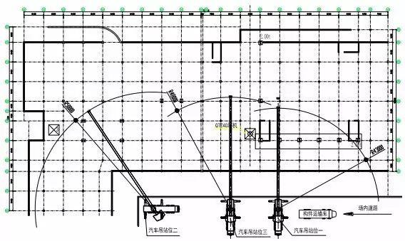 (2)汽車吊站位二:適用于 4-4軸至 9-4軸區(qū)域各層鋼構(gòu)件的轉(zhuǎn)運和吊裝。