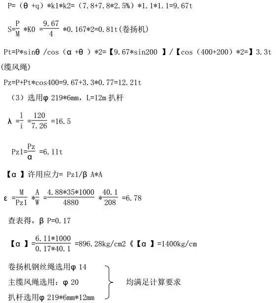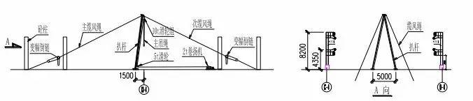 扒桿起豎在其前正后方分別設(shè)三根Φ 20╳35m主纜風(fēng)繩至扒桿頂部,正前方設(shè)二根Φ 16次纜風(fēng)繩,主、次纜風(fēng)繩的下端分別用鋼絲繩固定在砼柱下端。