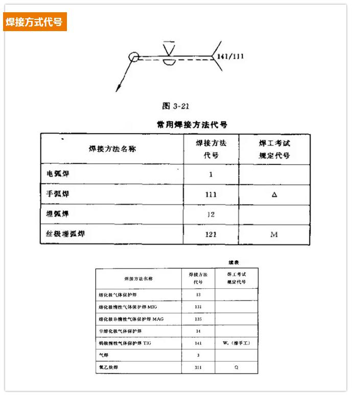 在焊接結(jié)構(gòu)圖樣上,焊接方法可按國(guó)家標(biāo)準(zhǔn)GB5185-85的規(guī)定用阿拉伯效字表示,標(biāo)注在指引線的尾部。常用焊接方法代號(hào)見(jiàn)表3-9所示。如果是組合焊接方法,可用“/”分開(kāi),左側(cè)表示正面(或蓋面)的焊接方法,右側(cè)表示背面(或打底)焊接方法。例如V形焊縫先采用鎢極氫弧焊打底,后用手工電弧焊蓋面,則表示為141/111。