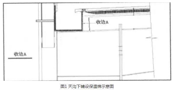 在寒冷地區(qū),冬季室內(nèi)外溫差大,內(nèi)天溝下會出現(xiàn)冷凝水,因此要求天溝下鋪設(shè)保溫棉,在施工中可采用圖1所示做法。保溫棉通過吊掛天溝的檁條固定。同時(shí),在天溝底部加一收邊(一般采用彩鋼板),如圖中收邊A,既美觀又可以固定保溫棉。
