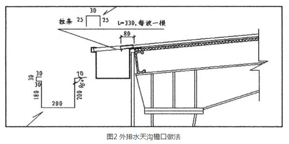 外排水天溝檐口由于防漏性好,造價(jià)較低,在工程也得以廣泛應(yīng)用。外排水檐口天溝多采有采板天溝。施工中彩板天溝不需要支撐它的結(jié)構(gòu)構(gòu)件,其溝壁可以直接與外墻板貼近,在墻面上設(shè)支撐件,在屋面板上伸出連接件挑在天溝的外壁上,各段天溝相互搭接,采用拉鉚釘連接和密封膠密封。工程中可采用圖2所示做法。