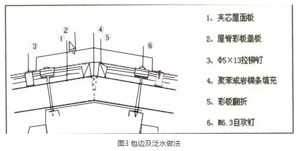 包邊及泛水不僅勾勒出建筑的線條,影響建筑的美觀程度,同時(shí)在結(jié)構(gòu)上把建筑聯(lián)結(jié)成一個(gè)整體,防風(fēng)、防雨,使建筑更堅(jiān)固耐用。具體見圖3所示。