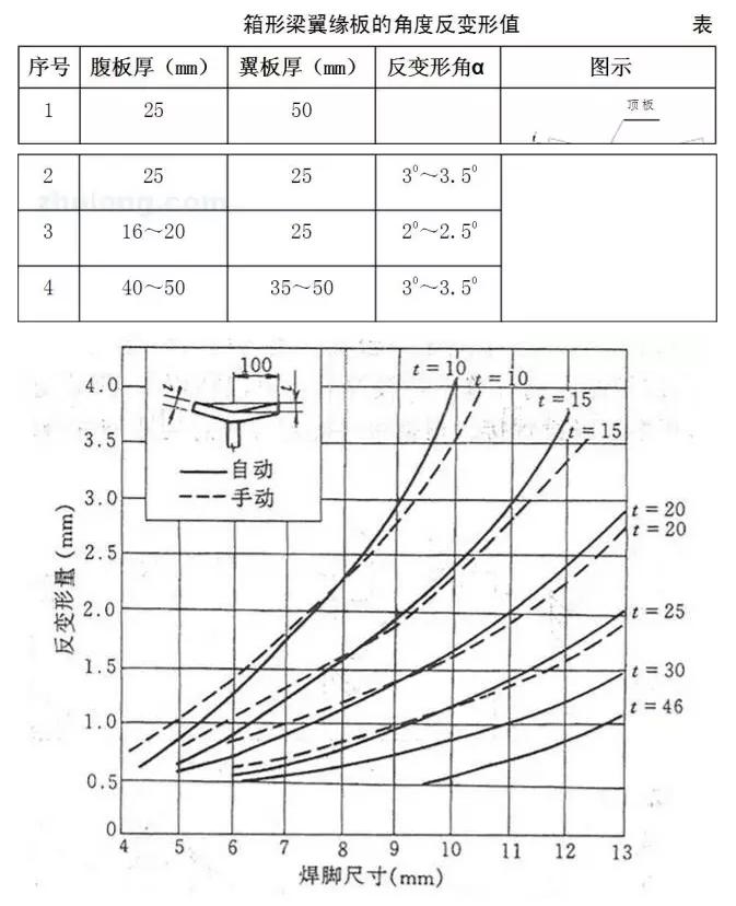 焊后彎曲的反變形,來達(dá)到防止焊后變形的目的。表1、圖4分別為箱形柱、H型鋼焊接前反變形參考數(shù)值: