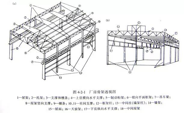(5)支撐——包括屋蓋支撐、柱間支撐及其它附加支撐。其作用是將單獨(dú)的平面框架連成空間體系,以保證結(jié)構(gòu)具有必要的剛度和穩(wěn)定性,同時也有承受風(fēng)力及吊車制動力的作用。