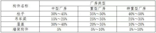 此外,還有一些次要的構(gòu)件如工作平臺、梯子、門窗等。各種構(gòu)件的用鋼量占整個廠房鋼結(jié)構(gòu)的總用鋼量的比值大致如表所示。