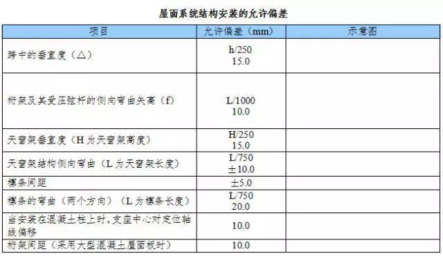 e.天窗架安裝可組裝在屋架上一同起吊。屋面系統(tǒng)結(jié)構(gòu)安裝的允許偏差應(yīng)符合下表規(guī)定。
