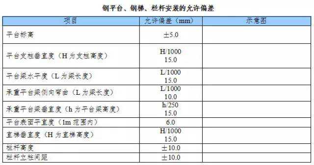 (3)欄桿安裝連接應(yīng)牢固可靠,扶手轉(zhuǎn)角應(yīng)光滑。(4)平臺、梯子和欄桿安裝的允許偏差應(yīng)符合下表規(guī)定。