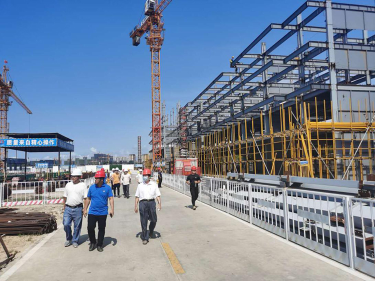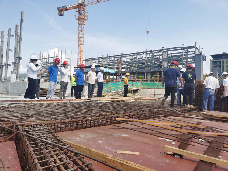 考察團主要參觀了主體結(jié)構(gòu)已經(jīng)施工的19#樓~22#樓。參觀過程中提出了地下室柱腳與基礎筏板鋼筋連接處理節(jié)點問題,鋼結(jié)構(gòu)安裝進度及裝配率等問題。隨后考察團一行人到會議室與我司管理人員進行深度交談。我司楊總和陳經(jīng)理一一介紹了本項目的規(guī)模和用鋼量,項目采用了我司專利-隱式鋼框架結(jié)構(gòu)體系,裝配率滿足政府申報裝配式住宅要求,并對構(gòu)件加工流程,進場流程,安裝流程,驗收流程,與土建工程施工工藝的對接合理安排,各節(jié)點問題也做了詳細的說明,同時所有鋼構(gòu)件由我司自有加工廠加工,能很好的控制項目成本及質(zhì)量。