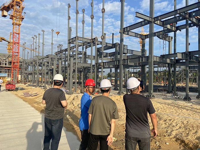 隨后參觀了紫荊苑項(xiàng)目,項(xiàng)目由17棟鋼結(jié)構(gòu)裝配式住宅樓組成,于2020年8月開工,分為三期,目前鋼結(jié)構(gòu)已經(jīng)封頂?疾靾F(tuán)一行對紫荊苑項(xiàng)目主體結(jié)構(gòu)施工進(jìn)度及措施、梁柱節(jié)點(diǎn)處理做法、鋼板墻構(gòu)件的安裝及焊接工藝等技術(shù)措施進(jìn)行交流探討。