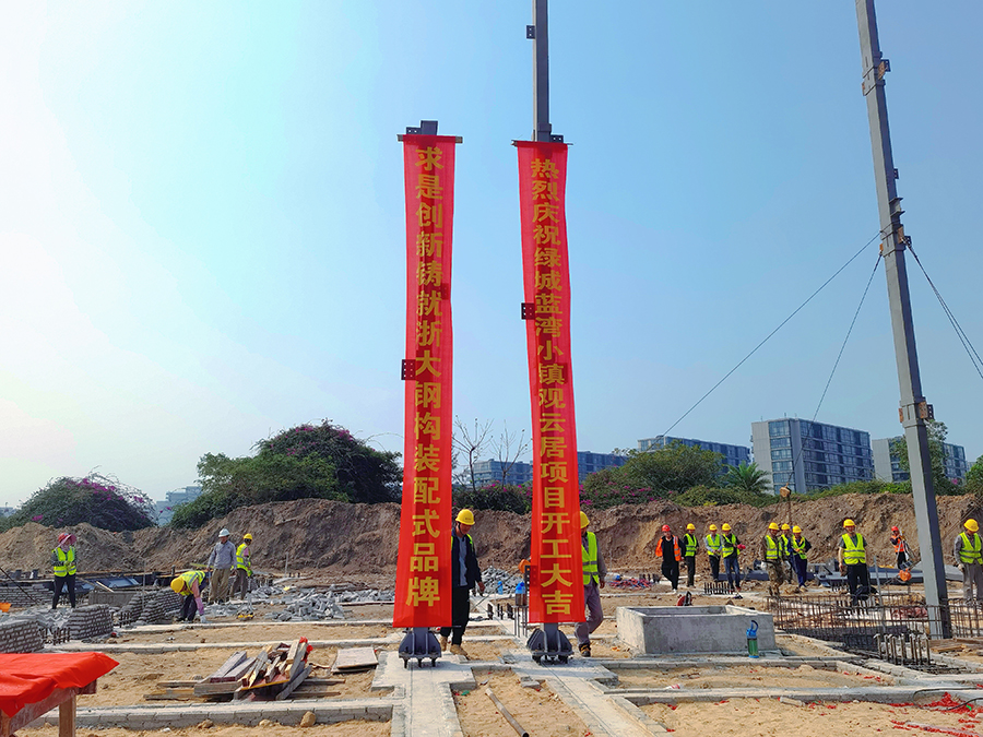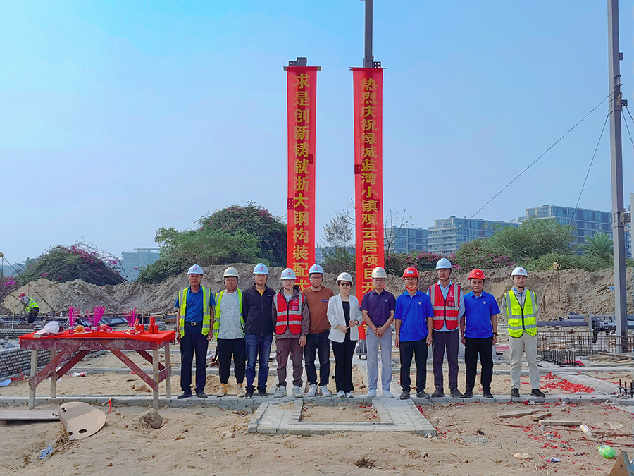 2023年2月25日上午10點(diǎn)08分,在甲方、監(jiān)理等領(lǐng)導(dǎo)的共同見(jiàn)證下,由浙大鋼構(gòu)承建的海南綠城藍(lán)灣小鎮(zhèn)繼2019年開(kāi)工的香樟苑項(xiàng)目以來(lái),第六個(gè)鋼結(jié)構(gòu)裝配式高端住宅項(xiàng)目——觀云居鋼結(jié)構(gòu)工程項(xiàng)目首根鋼柱吊裝順利完成,開(kāi)工儀式圓滿舉行,項(xiàng)目宣告正式進(jìn)入鋼結(jié)構(gòu)主體施工階段。