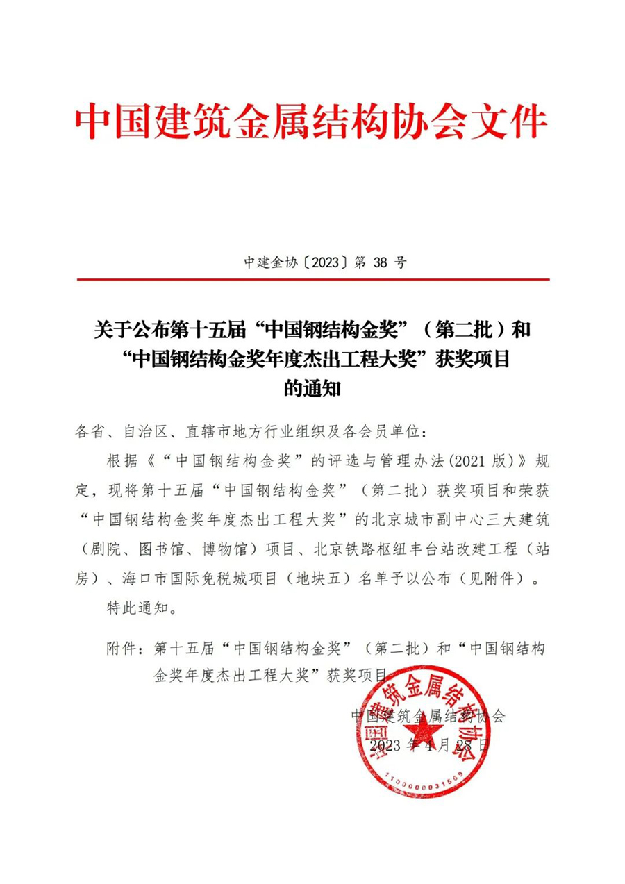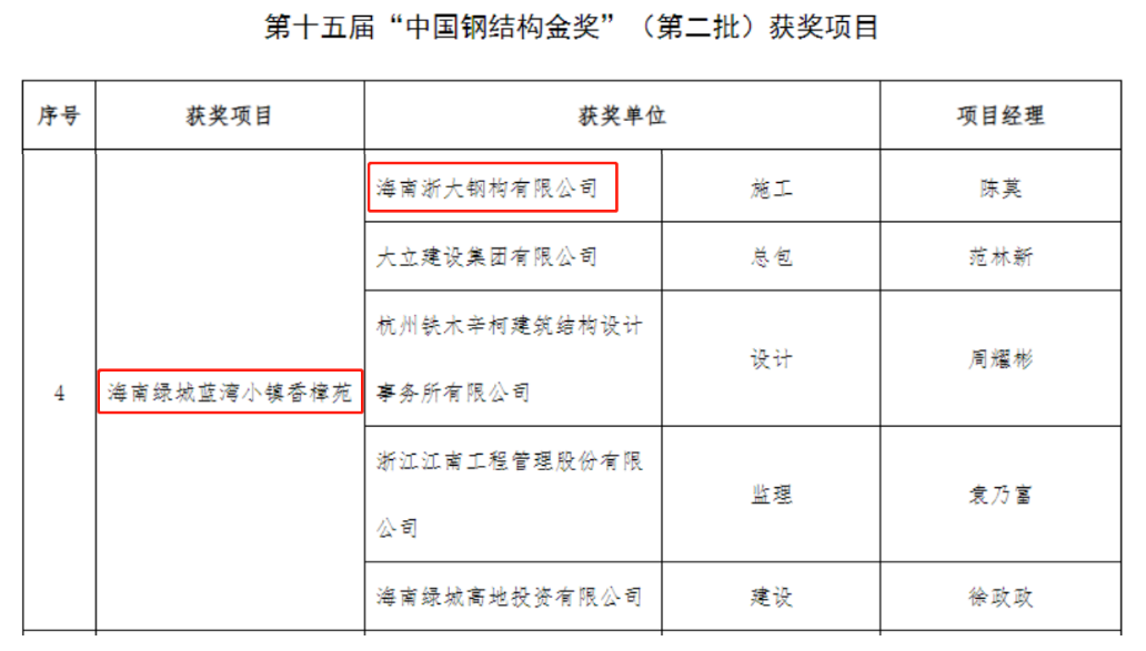 近日,中國(guó)建筑金屬結(jié)構(gòu)協(xié)會(huì)公布第十五屆“中國(guó)鋼結(jié)構(gòu)金獎(jiǎng)”(第二批)獲獎(jiǎng)項(xiàng)目名單。由海南浙大鋼構(gòu)有限公司承建的海南綠城藍(lán)灣小鎮(zhèn)香樟苑項(xiàng)目榮獲“中國(guó)鋼結(jié)構(gòu)金獎(jiǎng)”。“中國(guó)鋼結(jié)構(gòu)金獎(jiǎng)”作為全國(guó)性的評(píng)比達(dá)標(biāo)表彰保留項(xiàng)目,是我國(guó)鋼結(jié)構(gòu)行業(yè)工程質(zhì)量最高獎(jiǎng)項(xiàng),代表我國(guó)鋼結(jié)構(gòu)工程質(zhì)量領(lǐng)先水平。